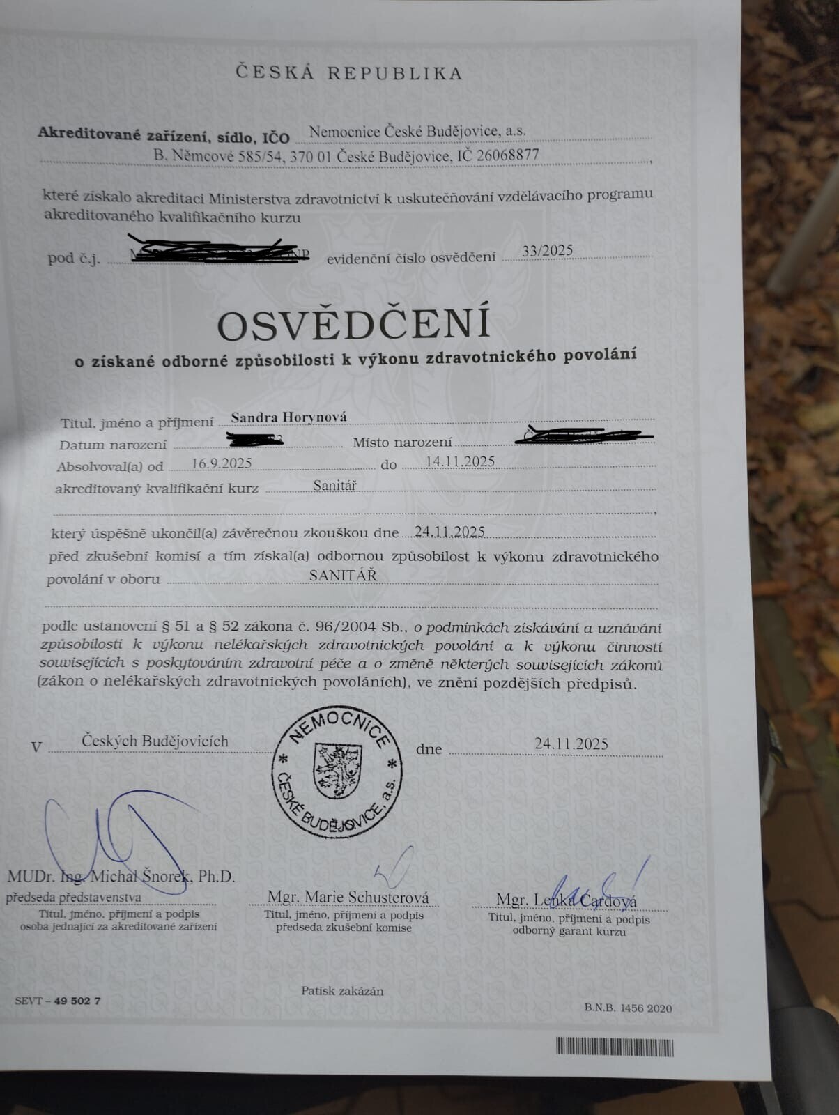 Z maminky 8 dětí Sandry Horynové je po úspěšném absolvování kursu paní Sanitářka! Poté, co se jí povedlo získat ty nejmenší děti do vlastní péče (https://nftp.cz/potrebuji-pomoc/134-sandra-horynova-na-cesty-s-malym-synem-do-nemocnice) si dala slib a dodržela ho. Gratulujeme!!! A vyřizujeme od Sandry Pozdravy a Poděkování vám všem, co jste jí podpořili finančně i psychicky.